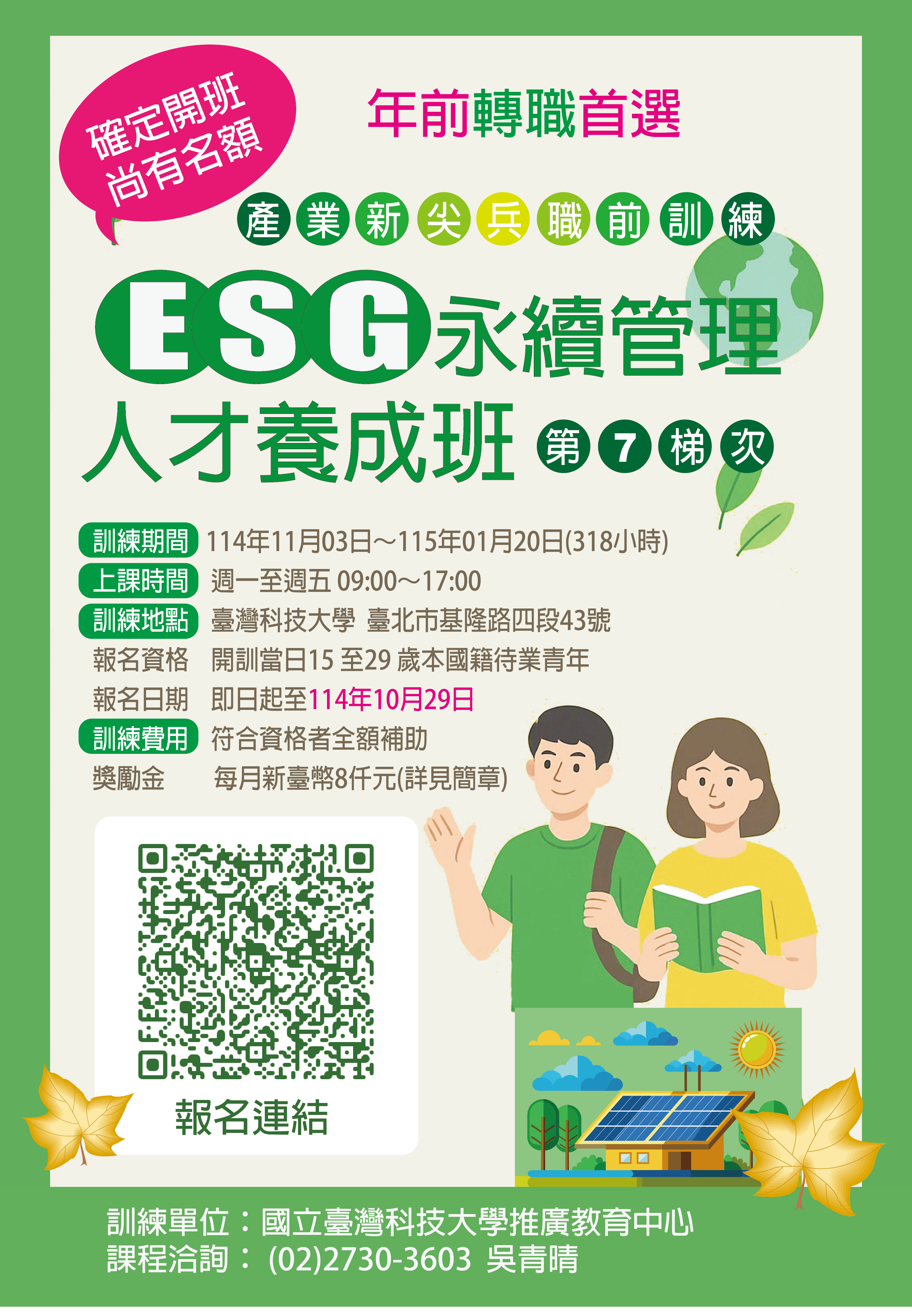 產業新尖兵ESG永續管理人才養成班(第7梯次)確定開班,尚有名額,歡迎報名