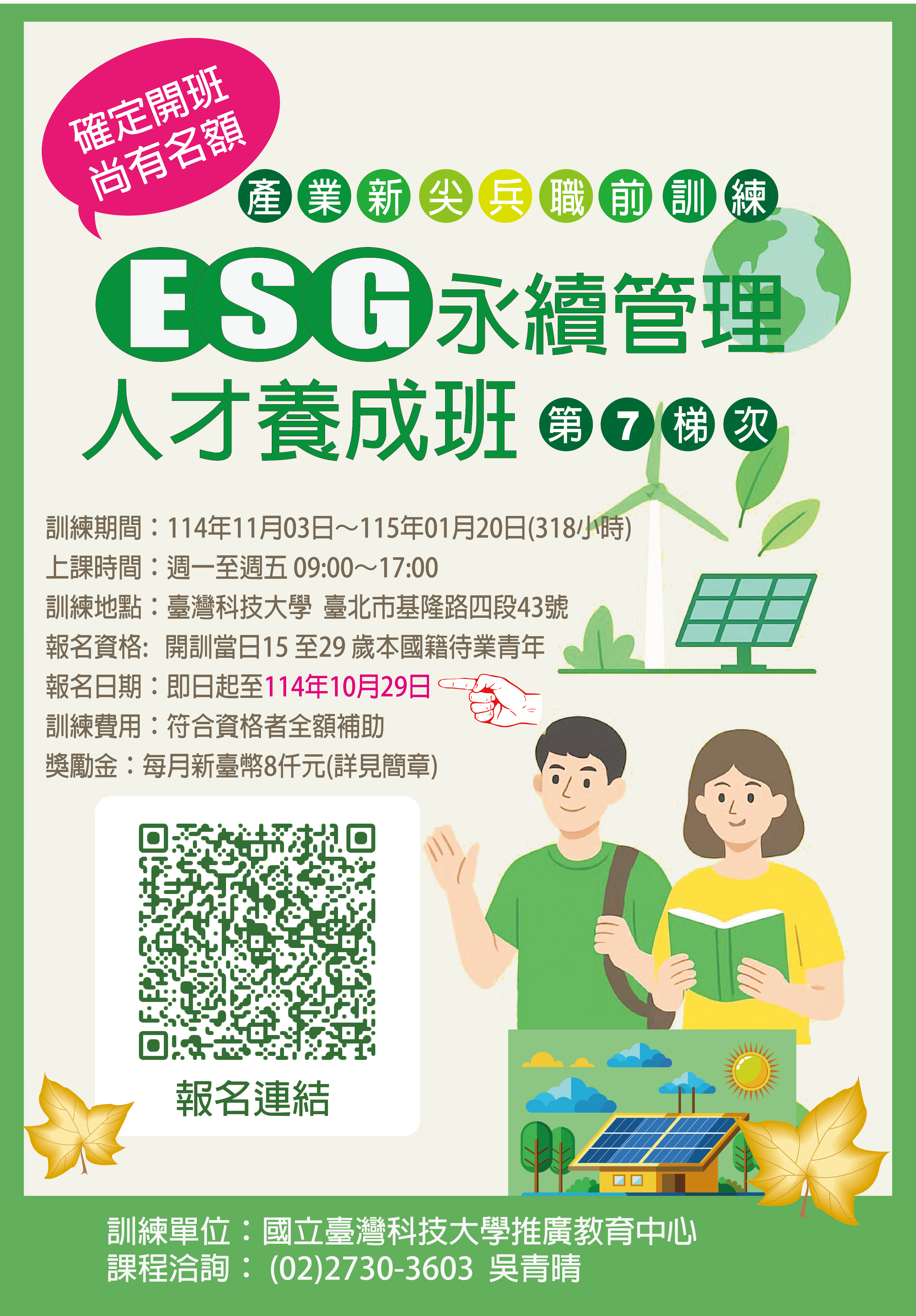 產業新尖兵ESG永續管理人才養成班(第7梯次)確定開班,尚有名額,歡迎報名