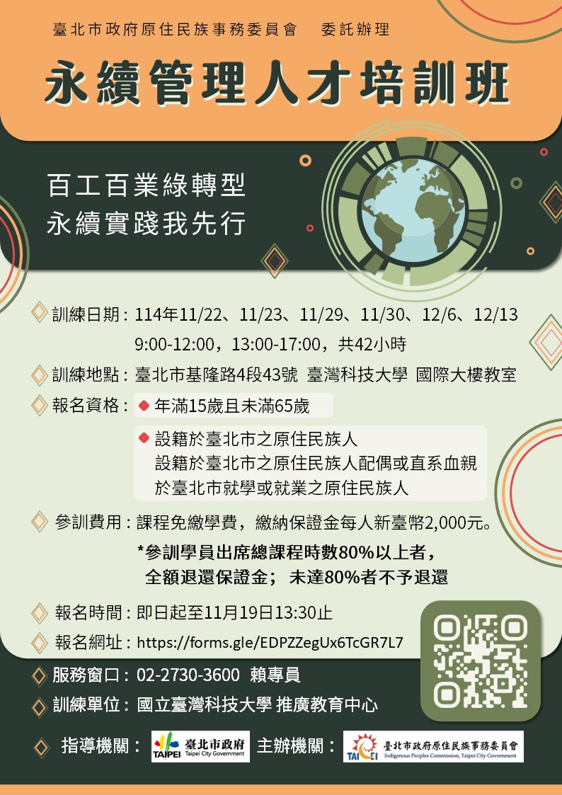 ✨北市原民會攜手台科大首發「永續管理人才培訓班」報名開始✨