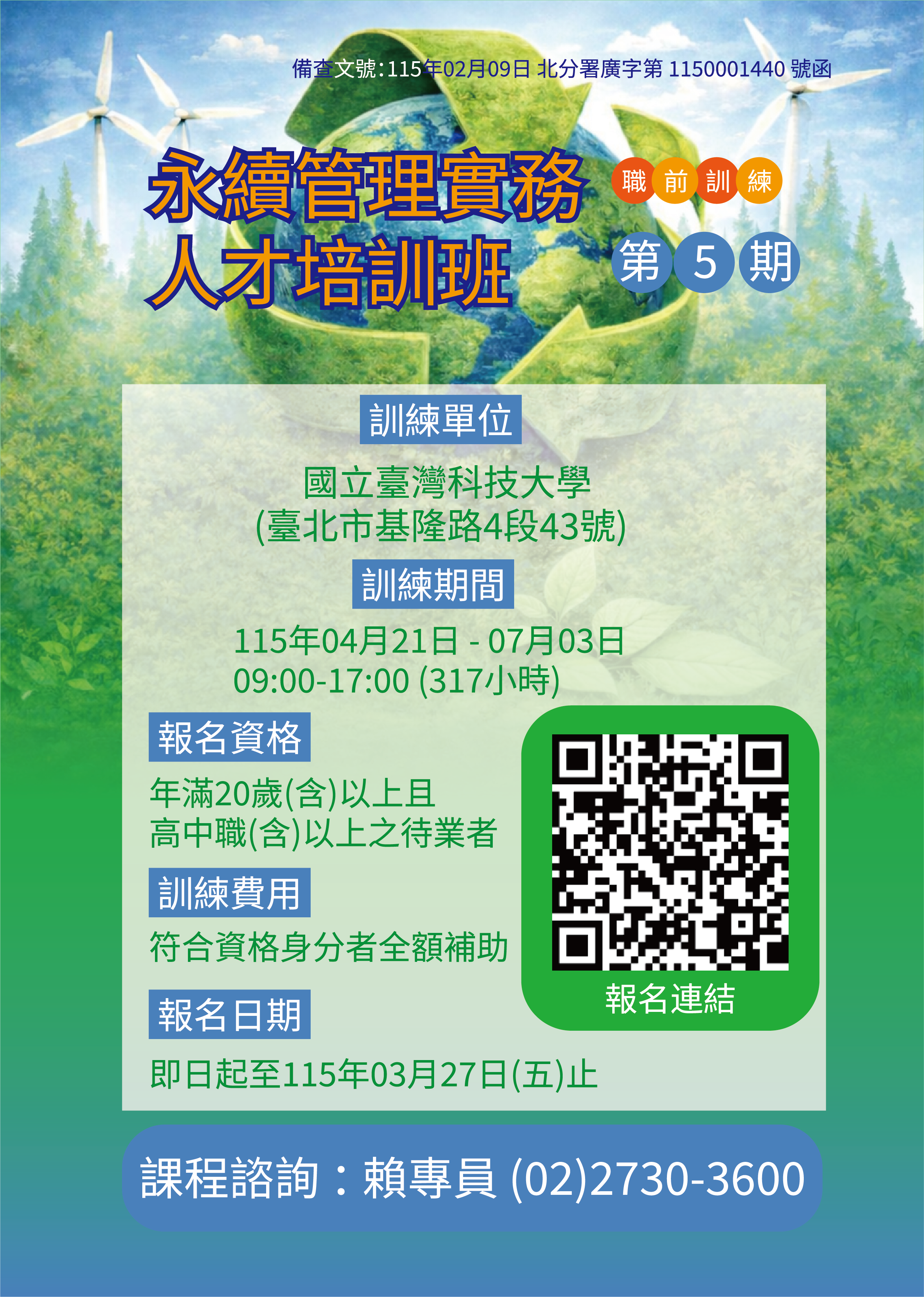 本課程為職前訓練課程,係以就業為導向之職業訓練,結合臺灣科技大學環工、綠能、管理等領域專家,以及產業界ESG 實務專家,規劃永續管理實務人才培訓班,期待透過完整訓練地圖培育「準綠領人才」。